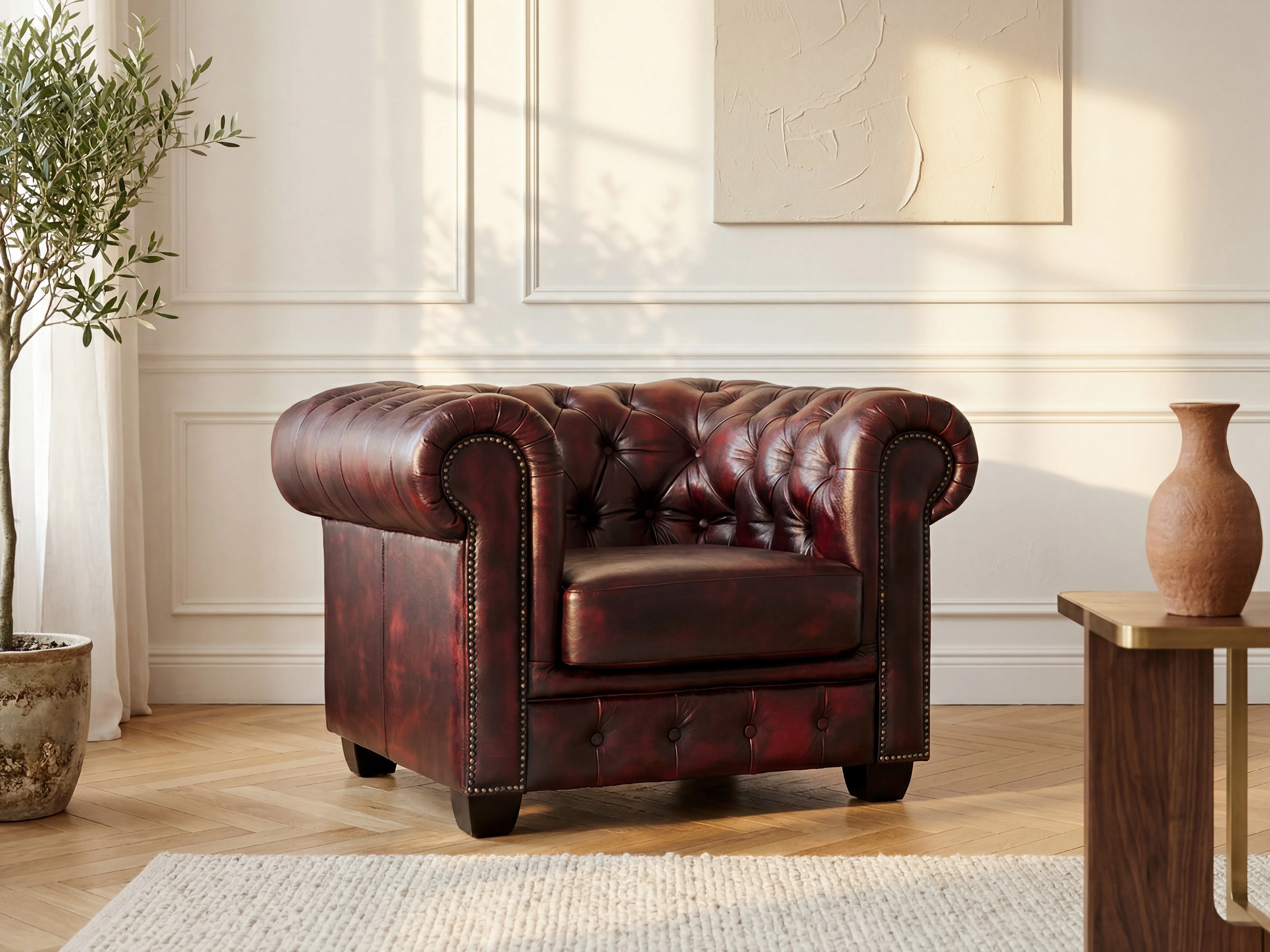 BRENTON Chesterfield Armchair 100% Buffalo Leather - Burgundy